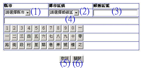- 選完鄉市區鎮之後會自動代出郵遞區號
